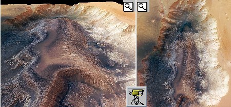 Si tratta di un gigantesco complesso di canyons situato nella zona equatoriale del pianeta, ad est della regione di Tharsis, che occupa circa un quarto della circonferenza di Marte e che venne chiamato così in onore della sonda spaziale Mariner 9; lungo circa 5000 km, largo fino 500 km e profondo 5-7 km, cioè dieci volte più lungo, sette volte più largo e profondo del Gran Canyon terrestre, è il più grande canyon del Sistema Solare! Dalla sua scoperta sono state avanzate molte teorie su come si sia formata una struttura simile; la prima supponeva si trattasse di un complesso di canali artificiali per l'irrigazione costruiti dai marziani, ipotesi abbandonata appena ci si rese conto che sulla superficie non c'erano nè acqua nè ossigeno. Attorno al 1960 venne proposto che fosse il risultato dell'erosione da parte dell'acqua liquida e dello scioglimento del permafrost; poi, nel 1972, venne avanzata l'ipotesi che si fosse formata per il ritiro di materiale magmatico sotterraneo. Attualmente si ritiene che la formazione delle Valles Marineris sia stata per certi versi analoga a quella della Rift Valley in Africa; si tratterebbe di un insieme fratture di natura tettonica formatesi contemporaneamente al sollevamento della regione di Tharsis, quindi circa 3.5 miliardi di anni fa, per il raffreddamento del pianeta e successivamente rimodellate ed ampliate dall'effetto dell'erosione atmosferica, o dalla sublimazione dell'anidride carbonica solida. |